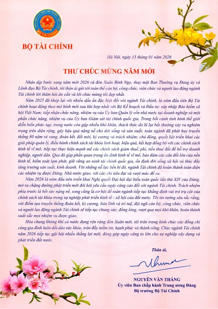 Bộ trưởng Bộ Tài chính gửi Thư chúc mừng năm mới tới các thế hệ Lãnh đạo và cán bộ, công chức, viên chức, người lao động Ngành Tài chính