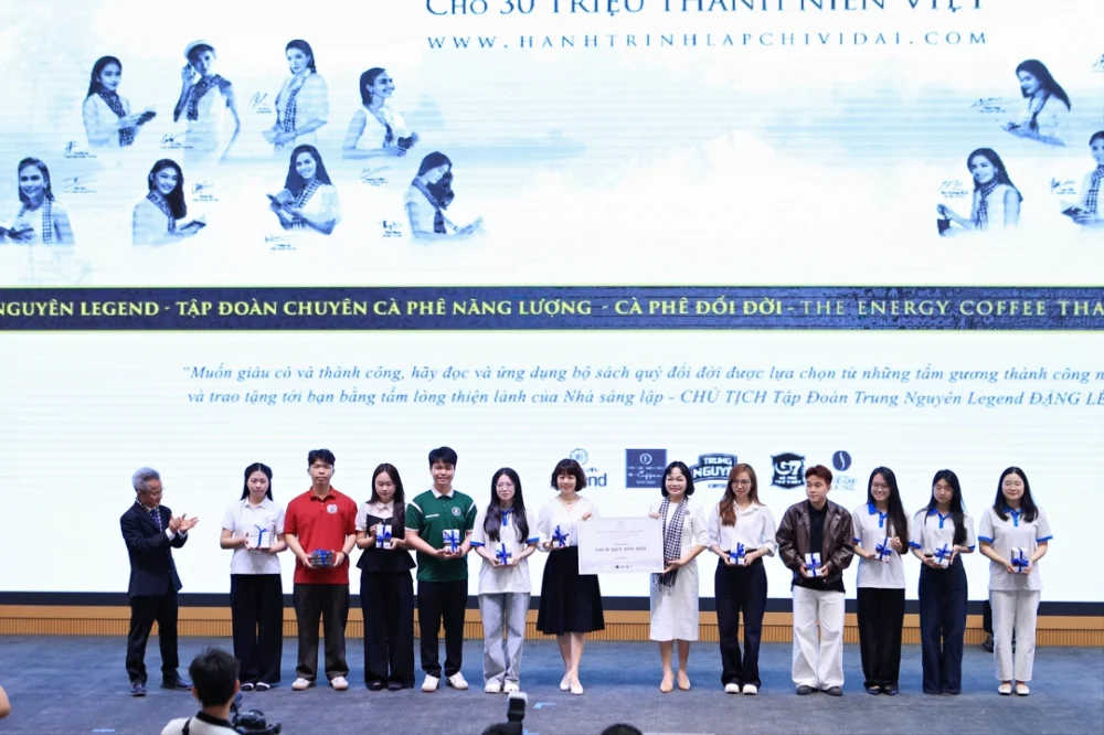 Đại diện Tập đoàn Trung Nguyên Legend trao tặng “Tủ sách nền tảng đổi đời” và học bổng cho sinh viên Học viện Chính sách và Phát triển