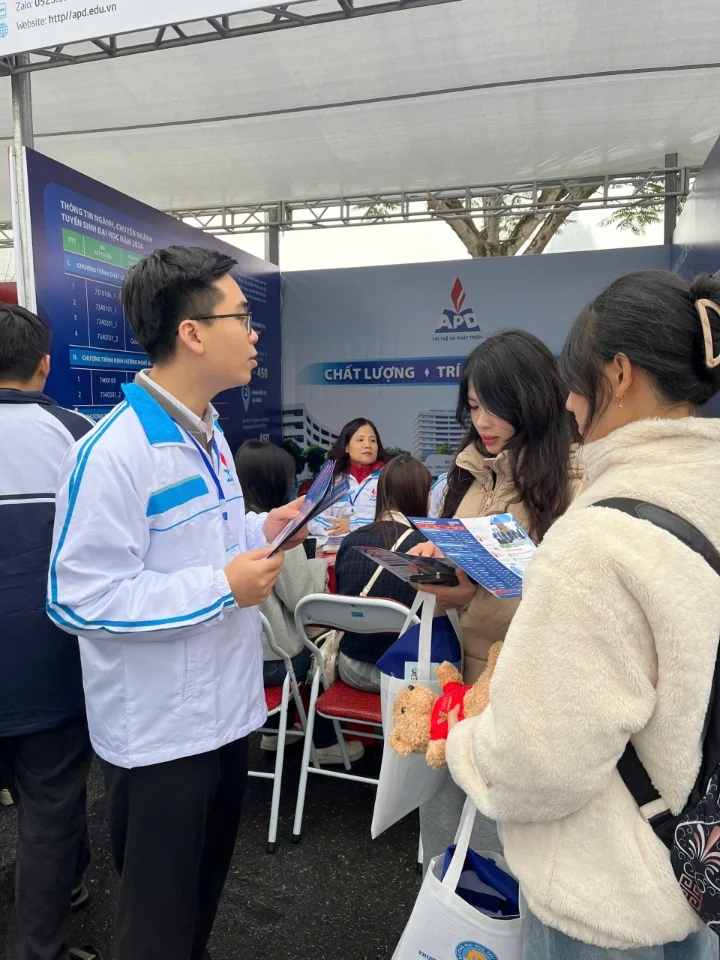 Rất đông các bạn học sinh đã vây quanh gian tư vấn của APD để tìm hiểu thông tin. Các câu hỏi được đặt ra liên tục, xoay quanh các vấn đề “nóng” nhất: “Học ngành Kinh tế số ra trường làm gì?”, “Điểm chuẩn ngành Logistics và Quản lý chuỗi cung ứng dự kiến bao nhiêu?”, “Học viện có những chính sách học bổng nào cho tân sinh viên?”, “Sự khác biệt giữa ngành Kinh tế và Kinh tế phát triển là gì?”.