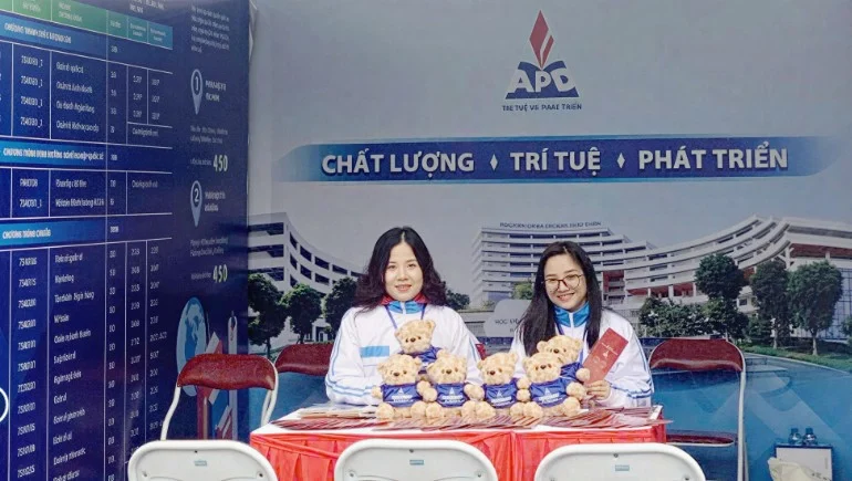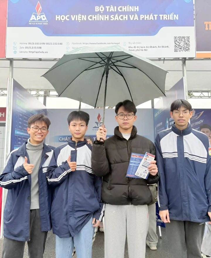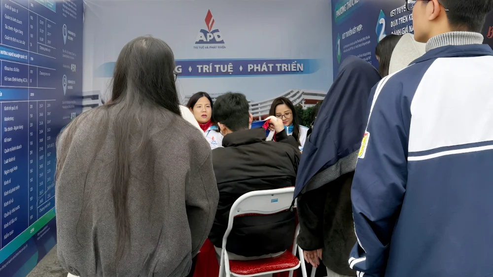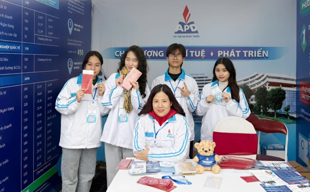 Rất đông các bạn học sinh đã vây quanh gian tư vấn của APD để tìm hiểu thông tin. Các câu hỏi được đặt ra liên tục, xoay quanh các vấn đề “nóng” nhất: “Học ngành Kinh tế số ra trường làm gì?”, “Điểm chuẩn ngành Logistics và Quản lý chuỗi cung ứng dự kiến bao nhiêu?”, “Học viện có những chính sách học bổng nào cho tân sinh viên?”, “Sự khác biệt giữa ngành Kinh tế và Kinh tế phát triển là gì?”.