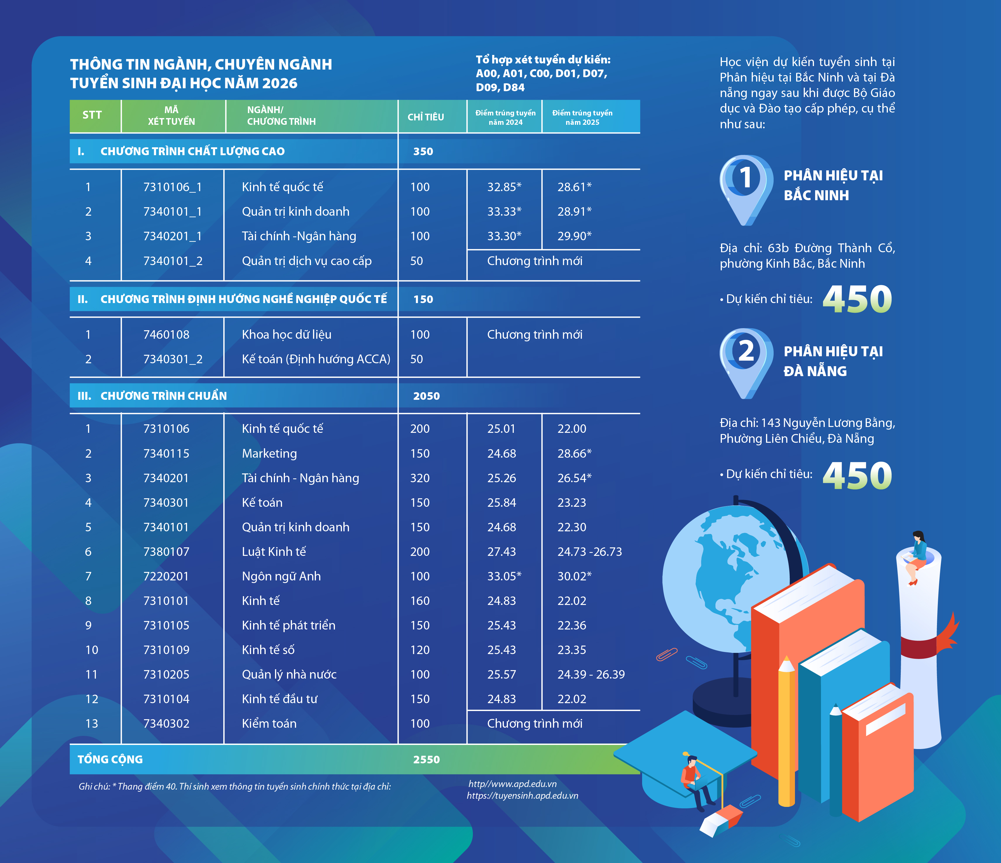 Nhằm cung cấp thông tin đầy đủ, chính xác và kịp thời về công tác tuyển sinh đại học năm 2026, đồng thời đồng hành cùng học sinh trong việc định hướng nghề nghiệp và lựa chọn ngành học phù hợp, Học viện Chính sách và Phát triển (APD) – Bộ Tài chính sẽ tiếp tục tham gia chuỗi Ngày hội tư vấn tuyển sinh – hướng nghiệp năm 2026 được tổ chức tại nhiều địa phương trong tháng 01/2026.