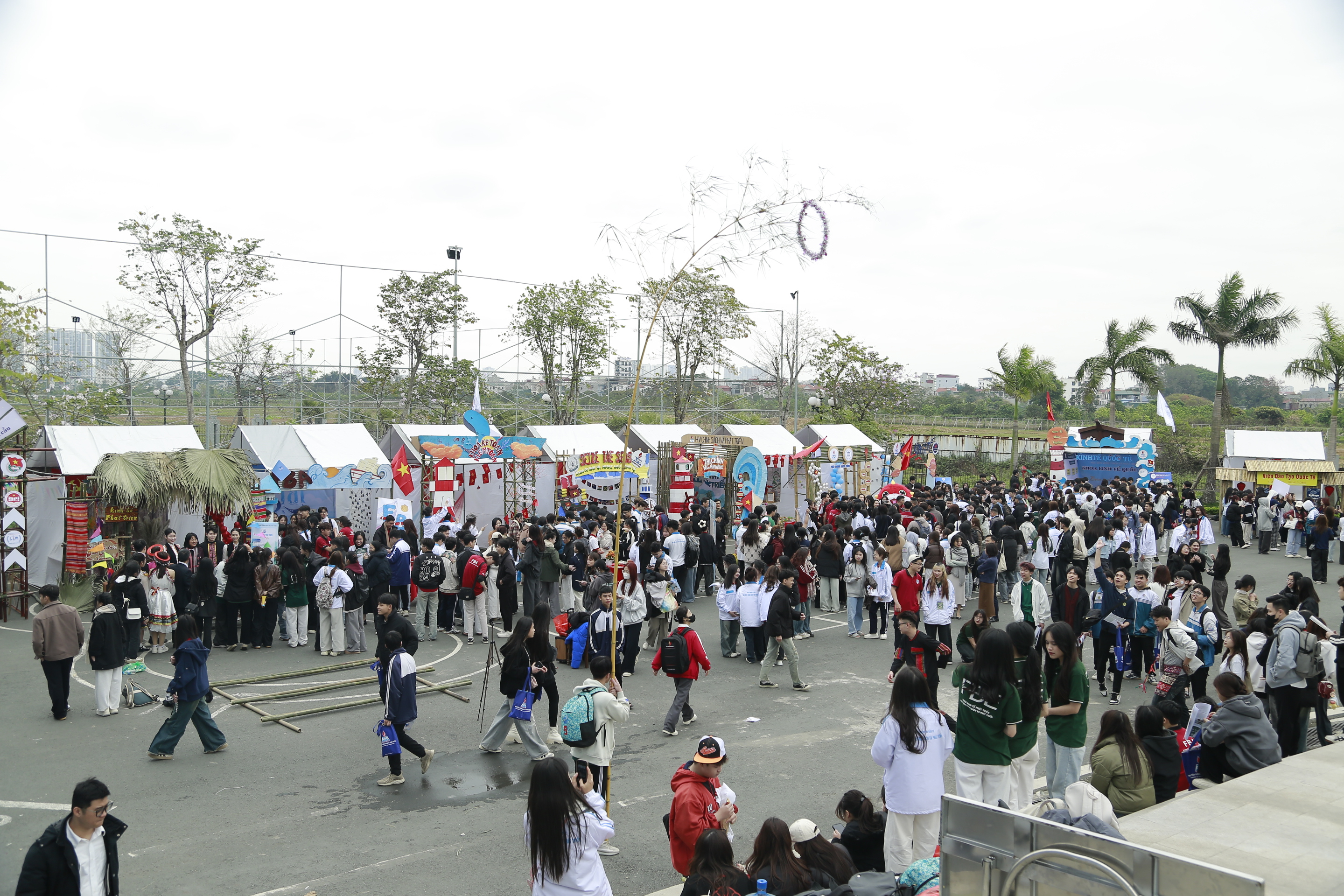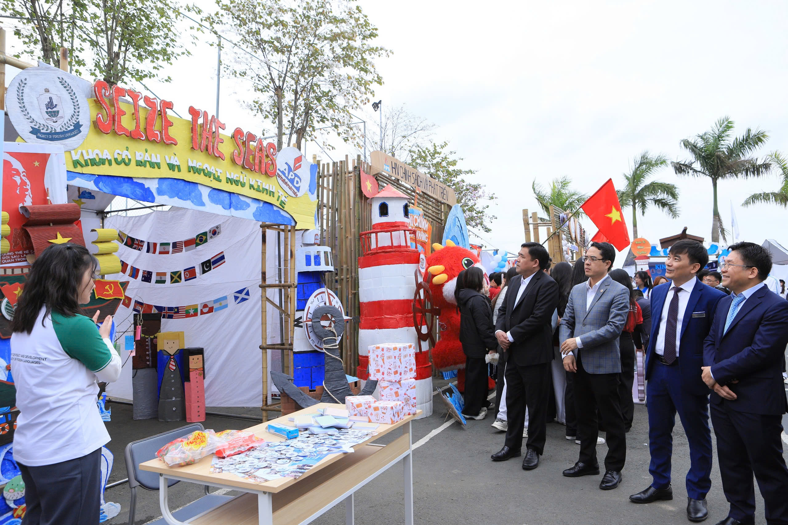 Tại khu vực sân canteen – ký túc xá của Học viện, không gian hội trại với chủ đề “Thanh niên sáng tạo – Vươn ra biển lớn” đã tái hiện trọn vẹn tinh thần tuổi trẻ APD qua những gian trại rực rỡ sắc màu, nơi sinh viên từ các khoa/viện cùng thể hiện sự năng động, đoàn kết và sáng tạo không giới hạn. Bên cạnh đó, cuộc thi ẩm thực với chủ đề “Hương vị mùa xuân” với những món ăn đậm đà, được chuẩn bị khéo léo bởi các đội thi đầy nhiệt huyết, thể hiện rõ nét sự linh hoạt và tài năng của sinh viên APD. Không khí sôi động tiếp tục bùng nổ trên sân thể thao, nơi các nội dung như kéo co, chèo thuyền trên cạn, nhảy bao bố, bánh xe thần tốc,… chứng kiến những màn tranh tài gay cấn và tinh thần đồng đội mạnh mẽ.