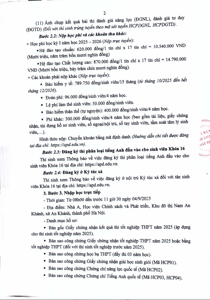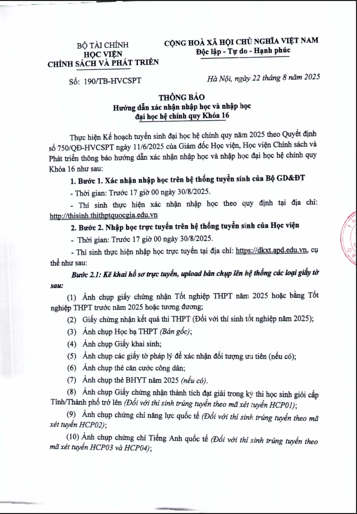 Đại học chính quy, Thông báo, Tin tức, Tuyển sinh 2025THÔNG BÁO HƯỚNG DẪN XÁC NHẬN NHẬP HỌC VÀ NHẬP HỌC ĐẠI HỌC HỆ CHÍNH QUY KHOÁ 16 Posted on Tháng 8 25, 2025Tháng 8 26, 2025 by Trần Hoàng Minh 25 Th8 Hướng dẫn chi tiết tại đây Thư của NGƯT, PGS, TS. Trần Trọng Nguyên – Giám đốc Học viện gửi chúc mừng Tân sinh viên K16 THÔNG BÁO TỔ CHỨC THI PHÂN LOẠI TIẾNG ANH ĐẦU VÀO CHO SINH VIÊN KHOÁ 16