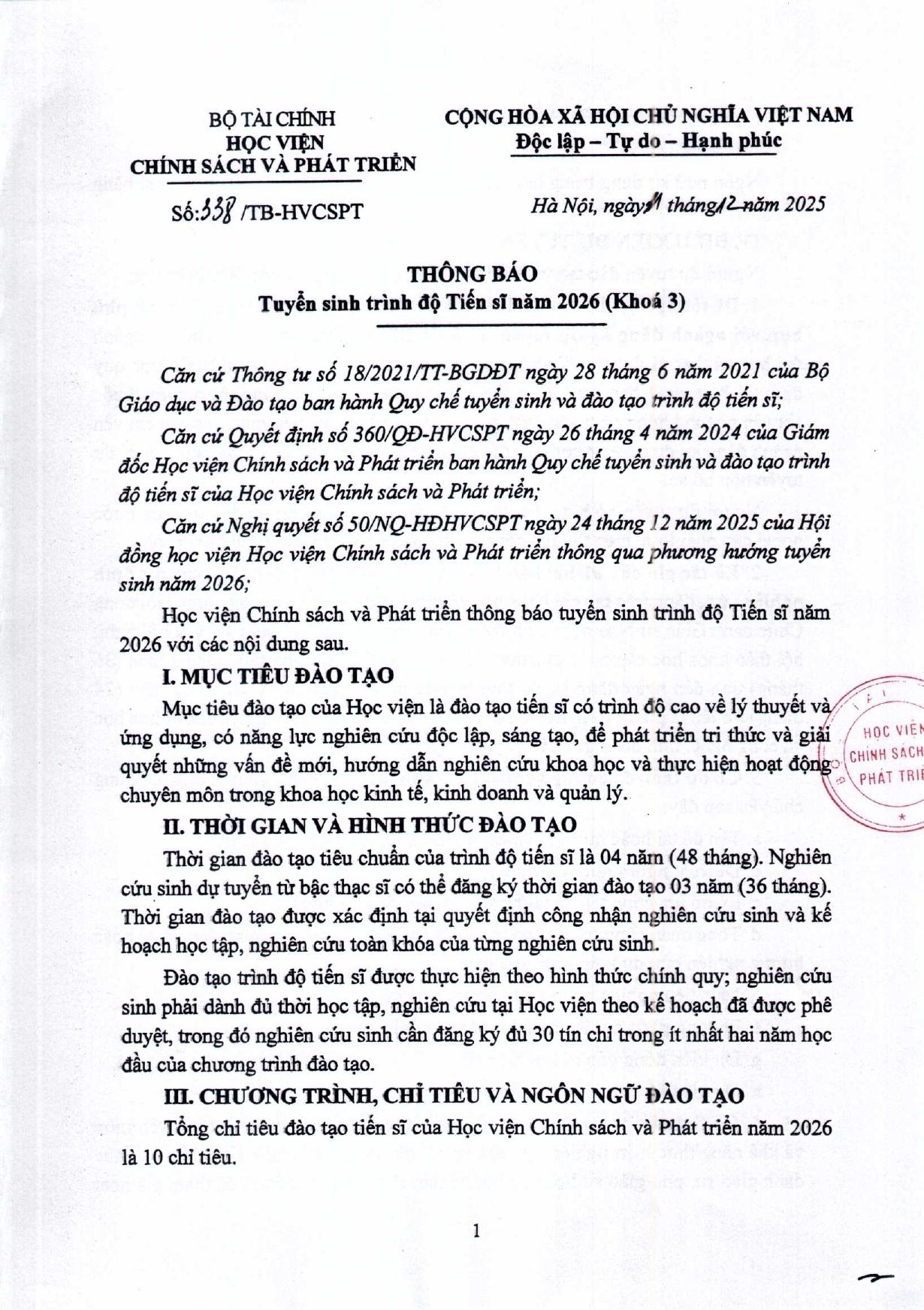 Quyết định Ban hành phương án tuyển sinh trình độ đại học năm 2026 của Học viện Chính sách và Phát triển